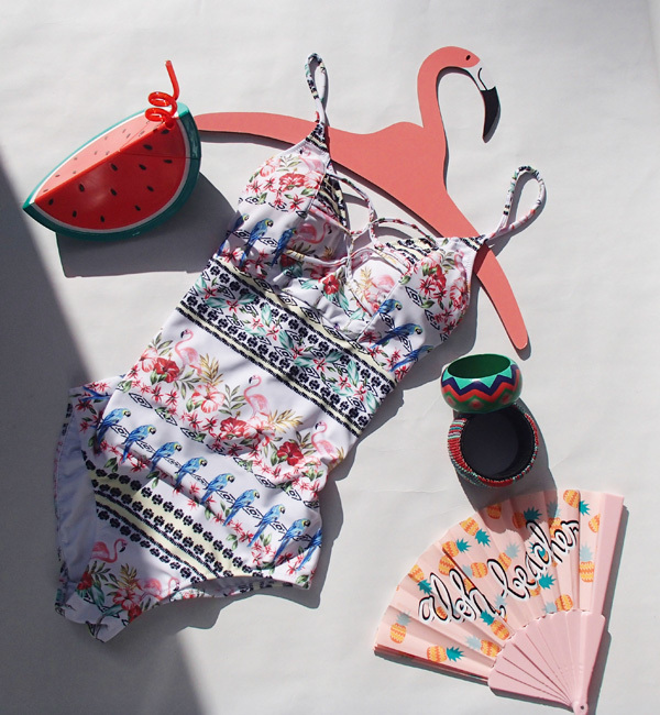 【送料無料】 色彩豊かなフラワーとバードをメインモチーフにした、インポートライクな総柄プリントが写真映えするワンピース水着です。三角ブラのようなカッティングのフロントにはクロスストラップのアクセントをプラス。バックは大胆な背中見せのレースアップデザインで開放感あふれるスタイルに仕上げました。 サンアイミズギラクエン/三愛水着楽園 水着・スポーツ|その他